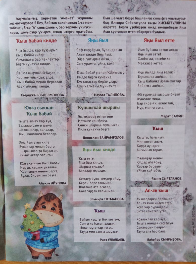 5 а класының бер төркөм уҡыусылары башланғыс синыфта уҡығанда уҡ шиғырҙар ижад итә башлайҙар.Уҡыусыларҙа был һөйөүҙе уҡытыусылары Әлмирә Сибәғәтулла ҡыҙы уята.Балалар үҙҙәренең ижад емештәрен Яңы йыл күстәнәсе итеп “ Аманат” журналына ебәрҙеләр. 9 а класы уҡыусыһы Нәркәс Сәфәрғәлина ла йәш дуҫтарынан ҡалышмай уҙе ижад иткән бик матур шиғырын журнал уҡыусыларына бүләк итте.Афарин, уҡыусылар, тип әйтәһе генә ҡала! Һеҙгә артабан да ижади уңыштар теләйбеҙ!