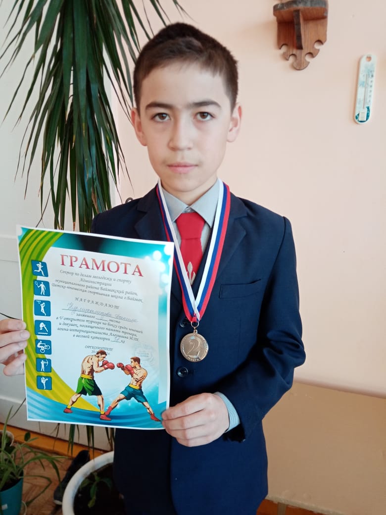 Не так давно мы от души радовались победам нашей юной спортсменки Нурмухаметовой Регины, которая становилась победителем и призером не только республиканских, но Всероссийских турниров по боксу. Сегодня мы шествуем её младшего брата, Нурмухаметова Данила, который занял 2 место в V открытом турнире по боксу среди юношей, посвященный памяти тренера, воина-интернационалиста Алгушаева И.Т. Желаем ему еще новых побед!